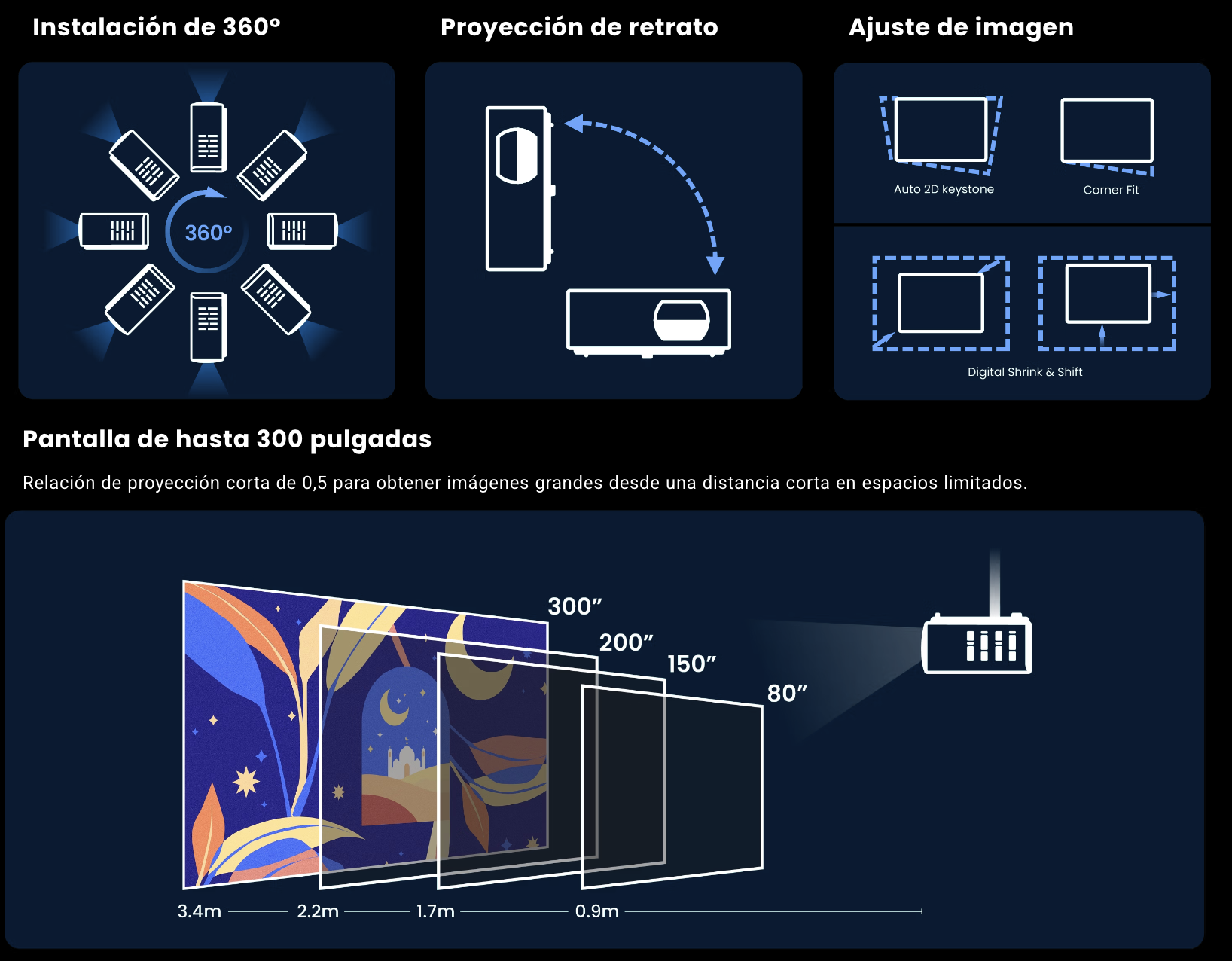 - Relación de proyección corta de 0,5 para imágenes grandes desde distancias cortas.